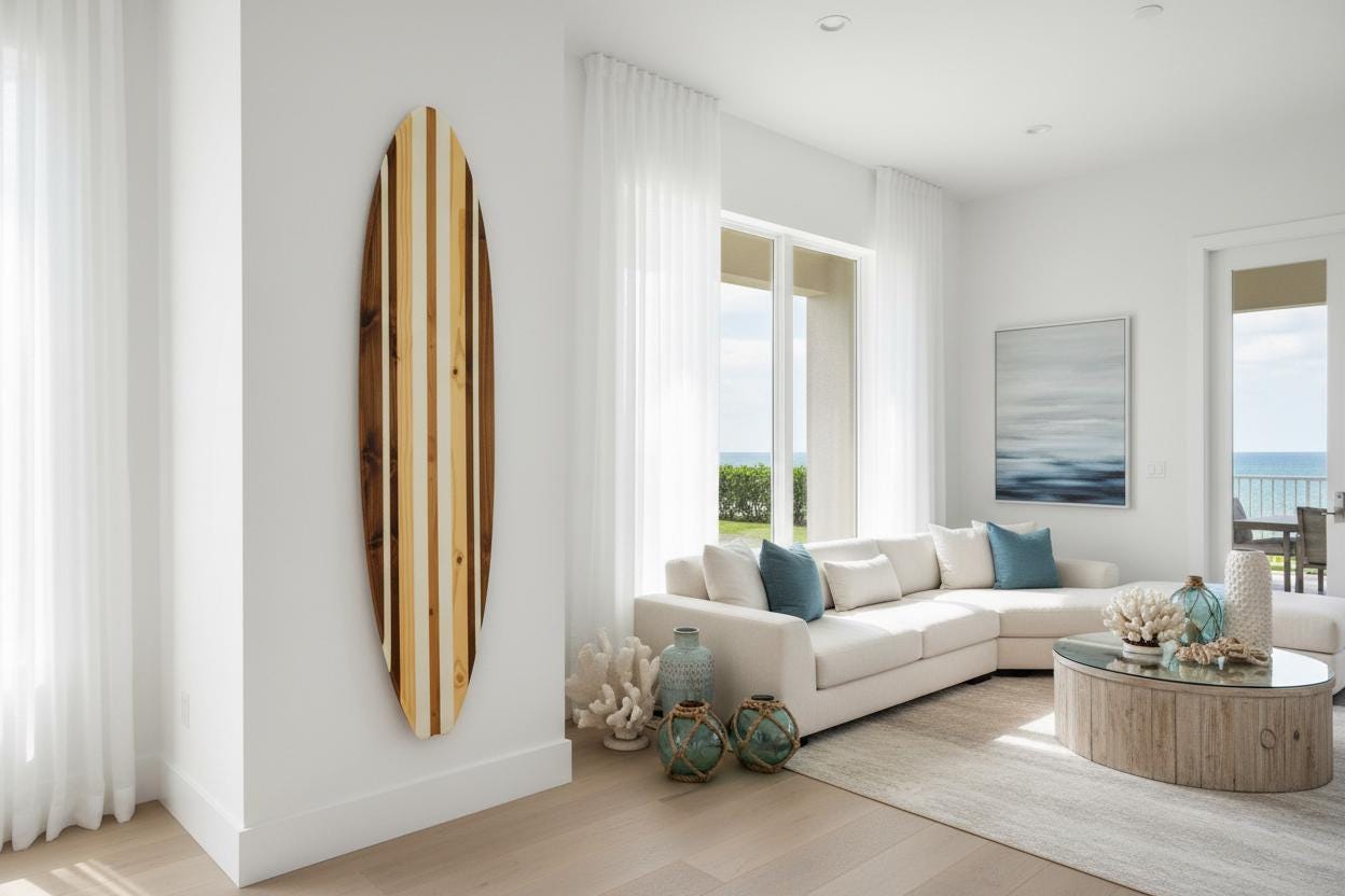Upgrade your space with authentic solid wood surfboard wall art, handcrafted for coastal homes, beach houses, and surf-inspired interiors. The Tidewater Surfboard is designed to feel elevated, natural, and timeless — never mass-produced, never generic.